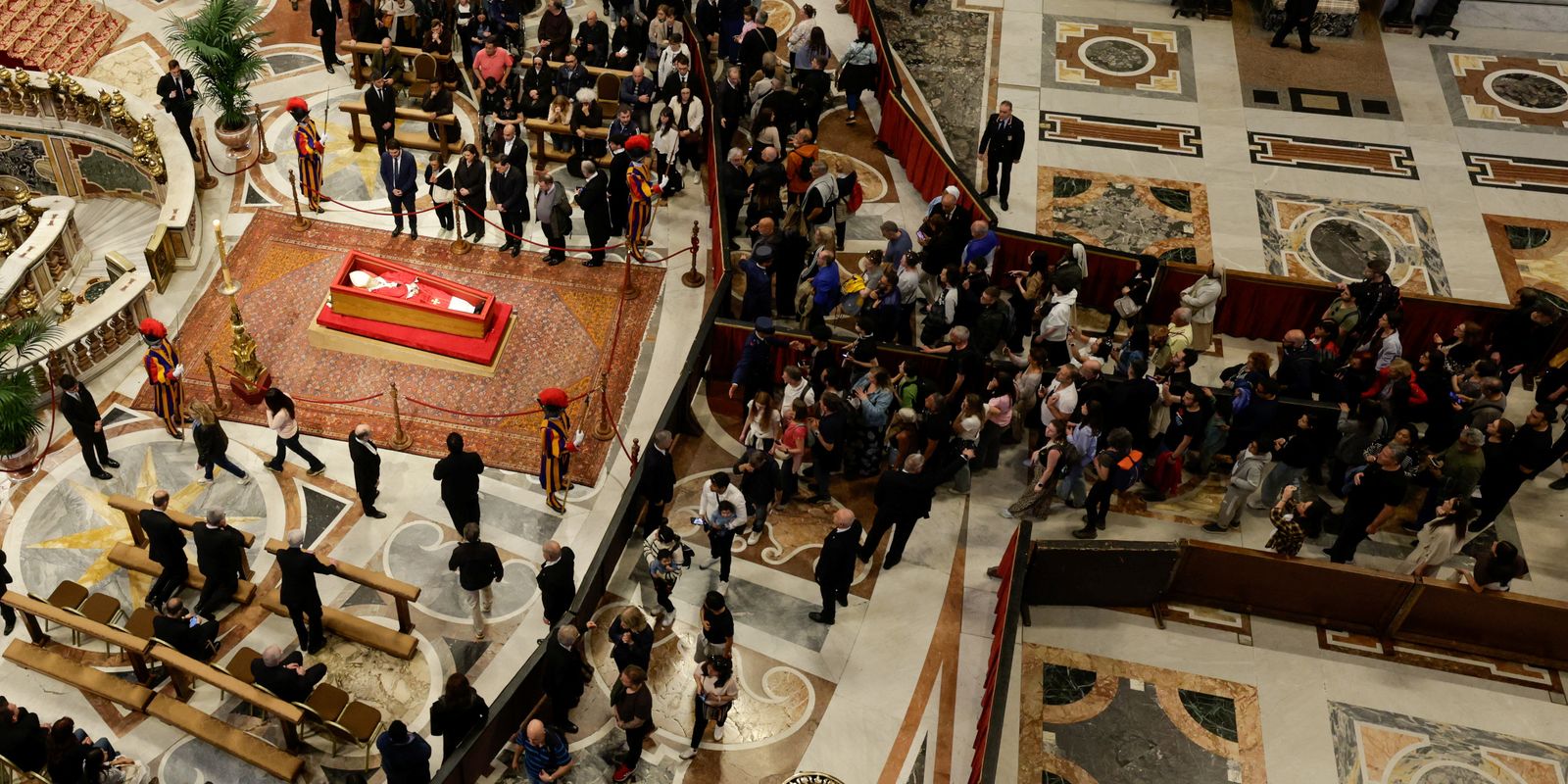 O corpo do papa ficou exposto na Basílica de São Pedro por 3 dias, para que milhares de pessoas pudessem dar seu adeus a Francisco. Na noite de sexta-feira (25), o caixão de madeira e zinco foi selado e colocado no átrio da Basílica, em frente ao altar.